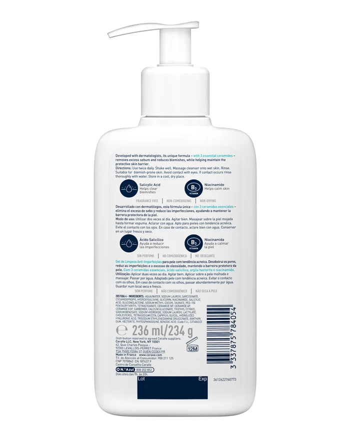 El Limpiador Control Imperfecciones CeraVe es no comedogénico, no obstruye los poros y no contiene perfume, lo que lo hace adecuado incluso para pieles sensibles dentro del espectro de piel grasa o acneica. Su textura en gel se transforma en una espuma ligera al contacto con el agua, facilitando una limpieza agradable y eficaz.